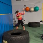 Jonas Abrahamsen traint met hamer op een mega autoband