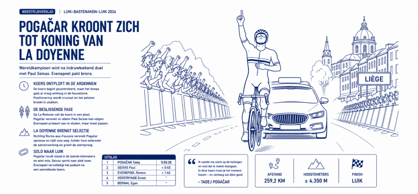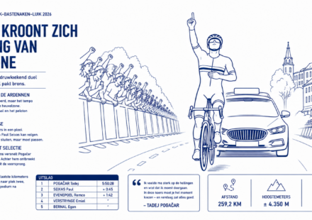 Het was opnieuw raak voor Tadej Pogačar in Luik-Bastenaken-Luik 2026. Na een slopende koers van bijna 260 kilometer trok de Sloveense wereldkampioen aan het langste eind, na een indrukwekkend duel met revelatie Paul Seixas. Remco Evenepoel vervolledigde…