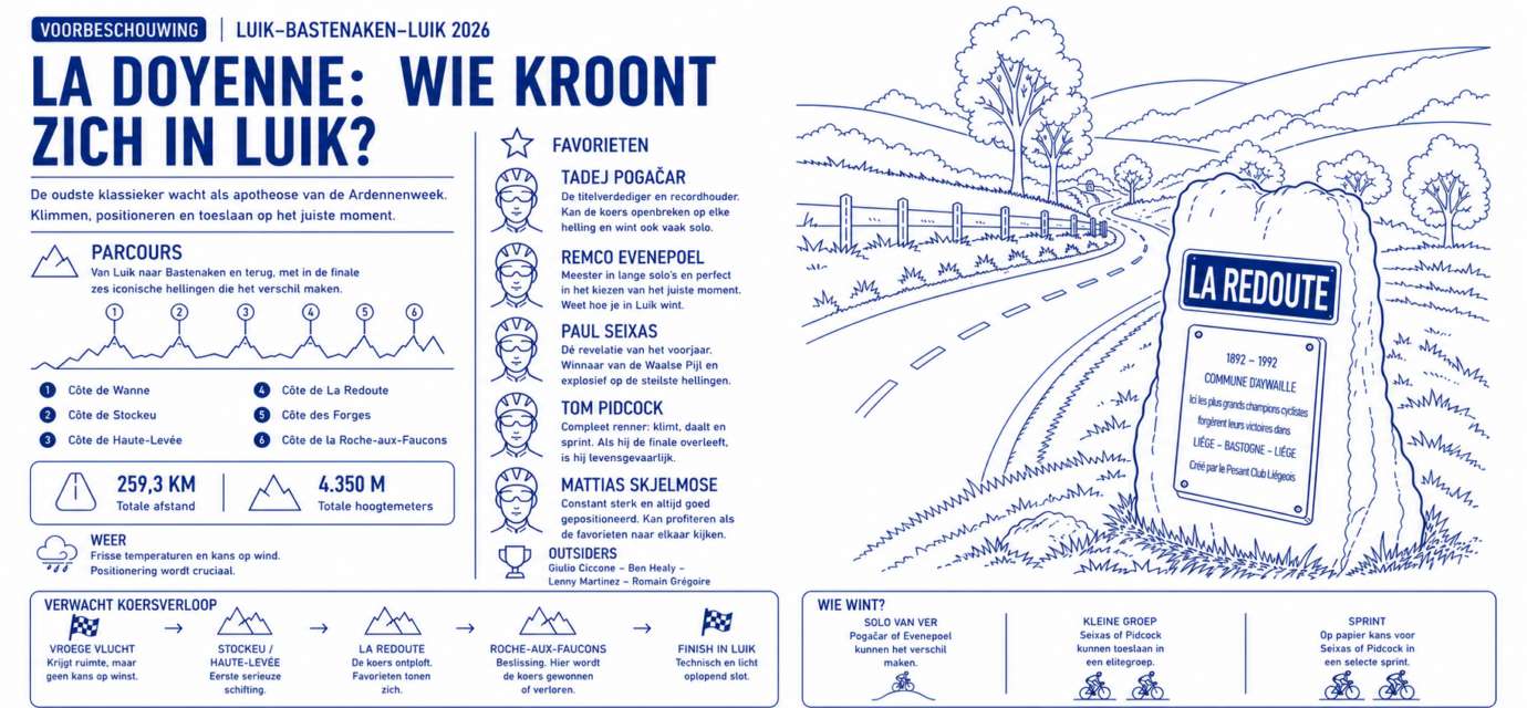 Zondag vormt Luik-Bastenaken-Luik opnieuw het slotstuk van het voorjaar. La Doyenne is geen koers voor opportunisten, maar voor renners met inhoud, timing en lef. Over ruim 250 kilometer en een opeenvolging van venijnige hellingen wordt het peloton…
